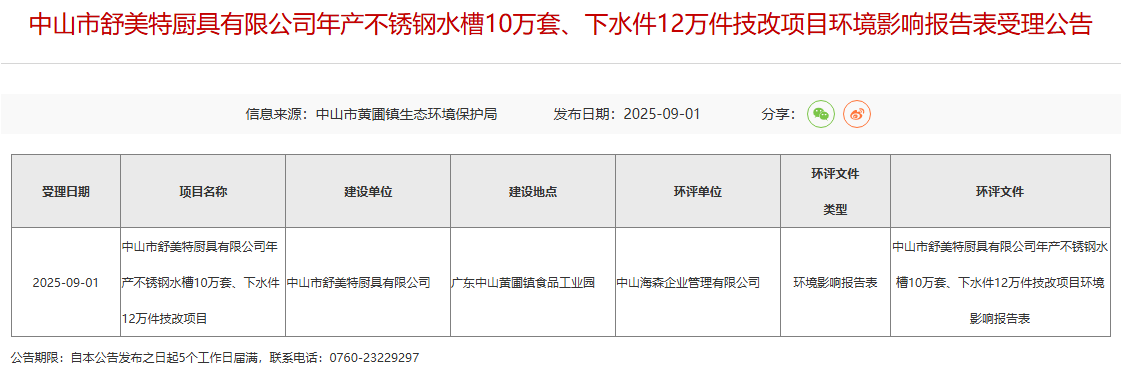 2025年9月1日,中山市黄圃镇生态环境保护局受理中山市舒美特厨具有限公司年产不锈钢水槽10万套、下水件12万件技改项目环境影响报告表并对外进行公告,公告期:5个工作日。