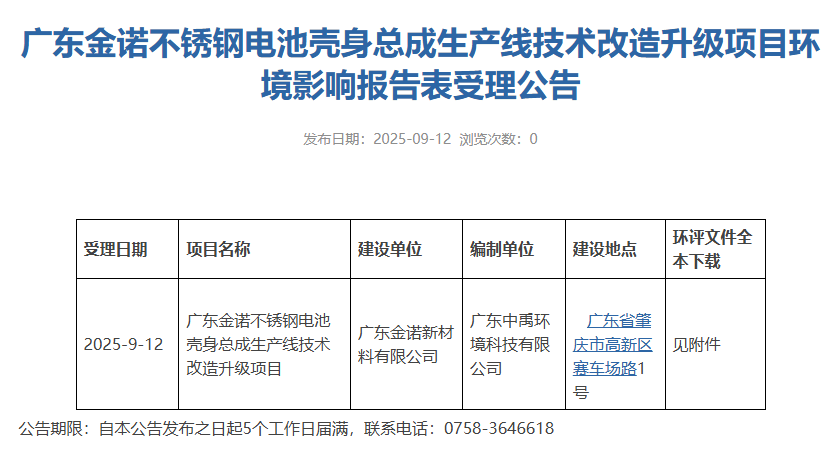 2025年9月12日,肇庆市生态环境局高新区分局受理广东金诺不锈钢电池壳身总成生产线技术改造升级项目环境影响报告表并对外进行公告,公告期:5个工作日。