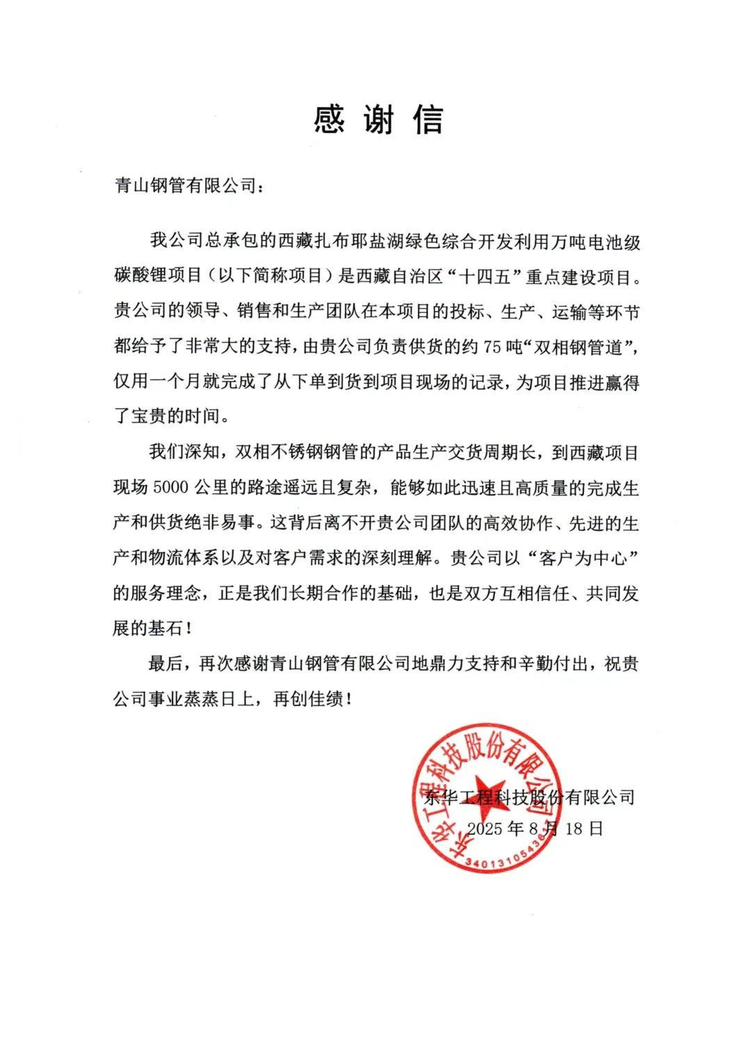 近日,青山钢管有限公司收到东华工程科技股份有限公司发来的感谢信,对公司在西 藏扎布耶盐湖绿色综合开发利用万吨电池级碳酸锂项目中的卓越表现予以高度肯定。