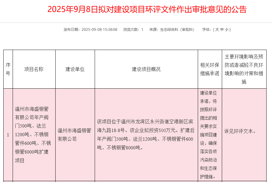 2025年9月8日,温州市生态环境局龙湾分局就温州市海盛钢管有限公司年产阀门500吨、法兰1200吨、不锈钢管件600吨、不锈钢管8000吨扩建项目环境影响评价报告表作出审批意见并对外进行公告,公告期:5个工作日。